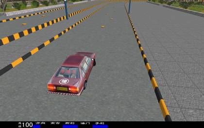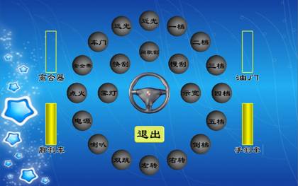 座艙包含了與真實車輛相同的操作部件,“五大”操縱機構(gòu):方向盤、離合器,腳剎,油門和手剎。真車變速器:倒檔、一檔、二檔、三檔、四檔、五檔和空擋(自動檔只含前進(jìn)檔、倒車檔和駐車檔)。真車操作開關(guān):左轉(zhuǎn)向燈、右轉(zhuǎn)向燈、應(yīng)急燈、喇叭、點火開關(guān)、總電開關(guān)、安全帶、車門、雨刷、遠(yuǎn)光燈、近光燈、遠(yuǎn)近光交替。