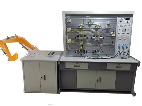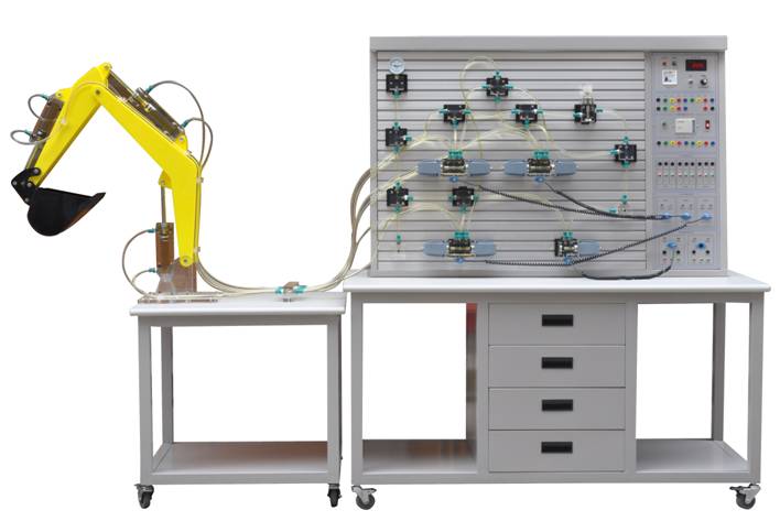 1、在原有透明液壓PLC控制實驗裝置幾十種基本回路上增加了可模擬真實挖掘機工作裝置各種動作。