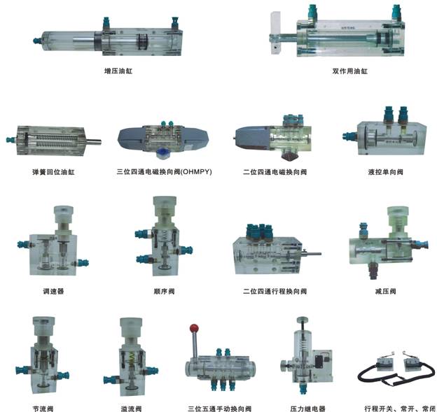 2、透明液壓試驗臺主要由實驗桌、實驗支架、液壓元件和電器控制器件、可編程控制器(PLC)等組件組成。